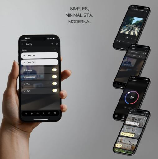 Comande sua casa direto do celular: controle luzes, cortinas, climatização, câmeras e muito mais com praticidade e precisão — esteja dentro ou fora de casa.